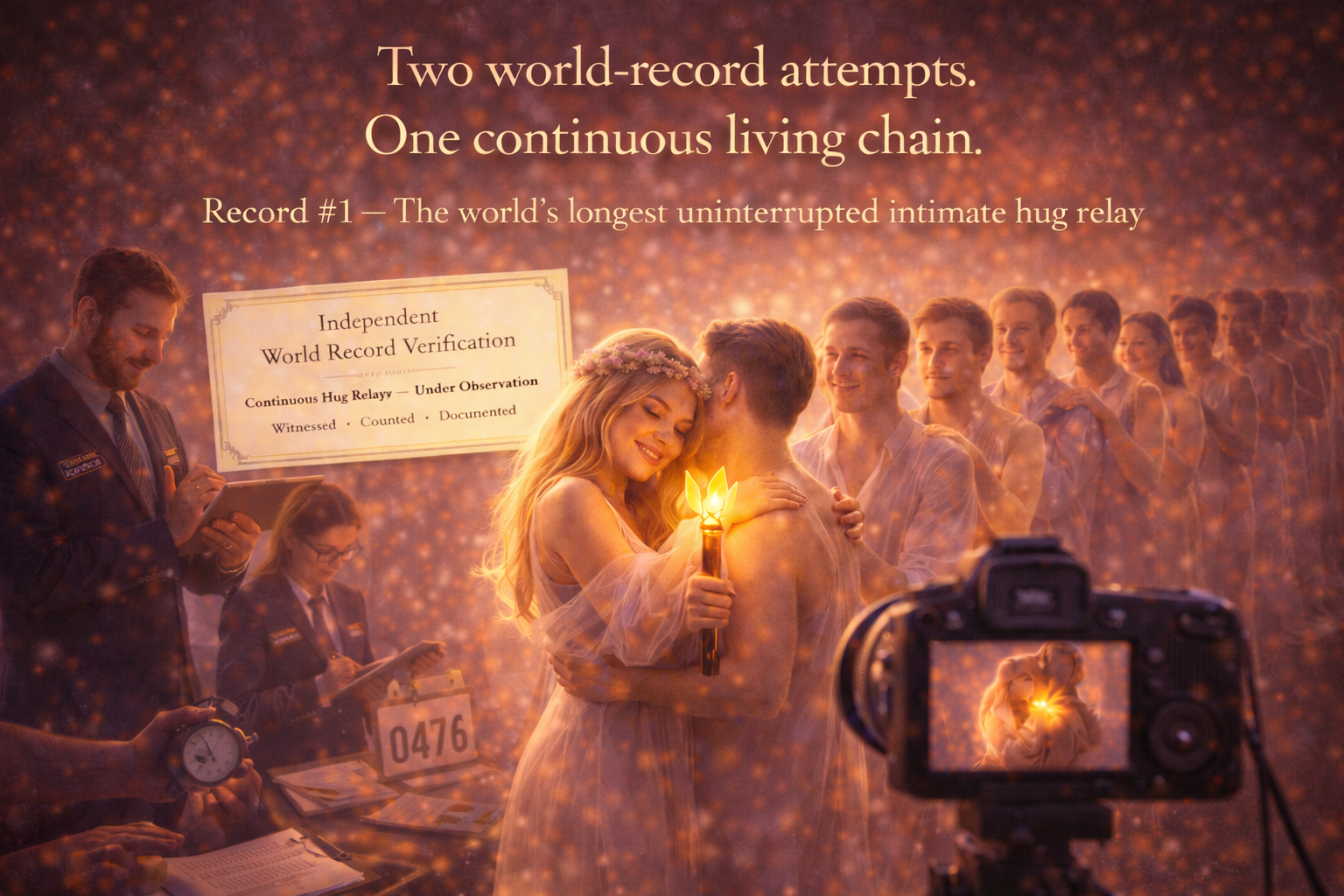 This layer is built around the hug-relay record: an uninterrupted human chain presented exclusively through SFW visuals—hugs, smiles, baton passing, counters, and visible progress.