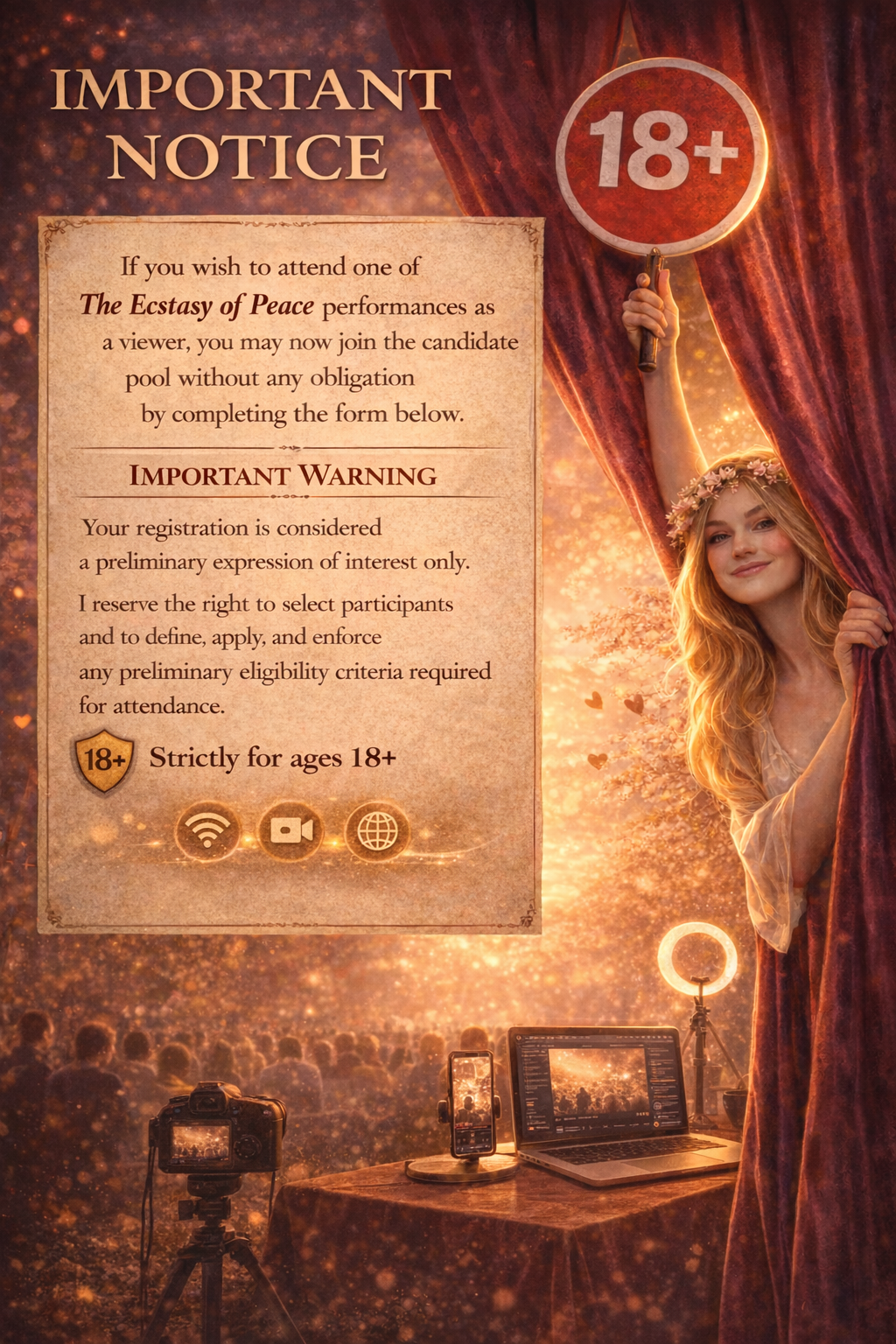 If you wish to attend one of The Ecstasy of Peace performances as a viewer, you may now join the candidate pool without any obligation by completing the form below.