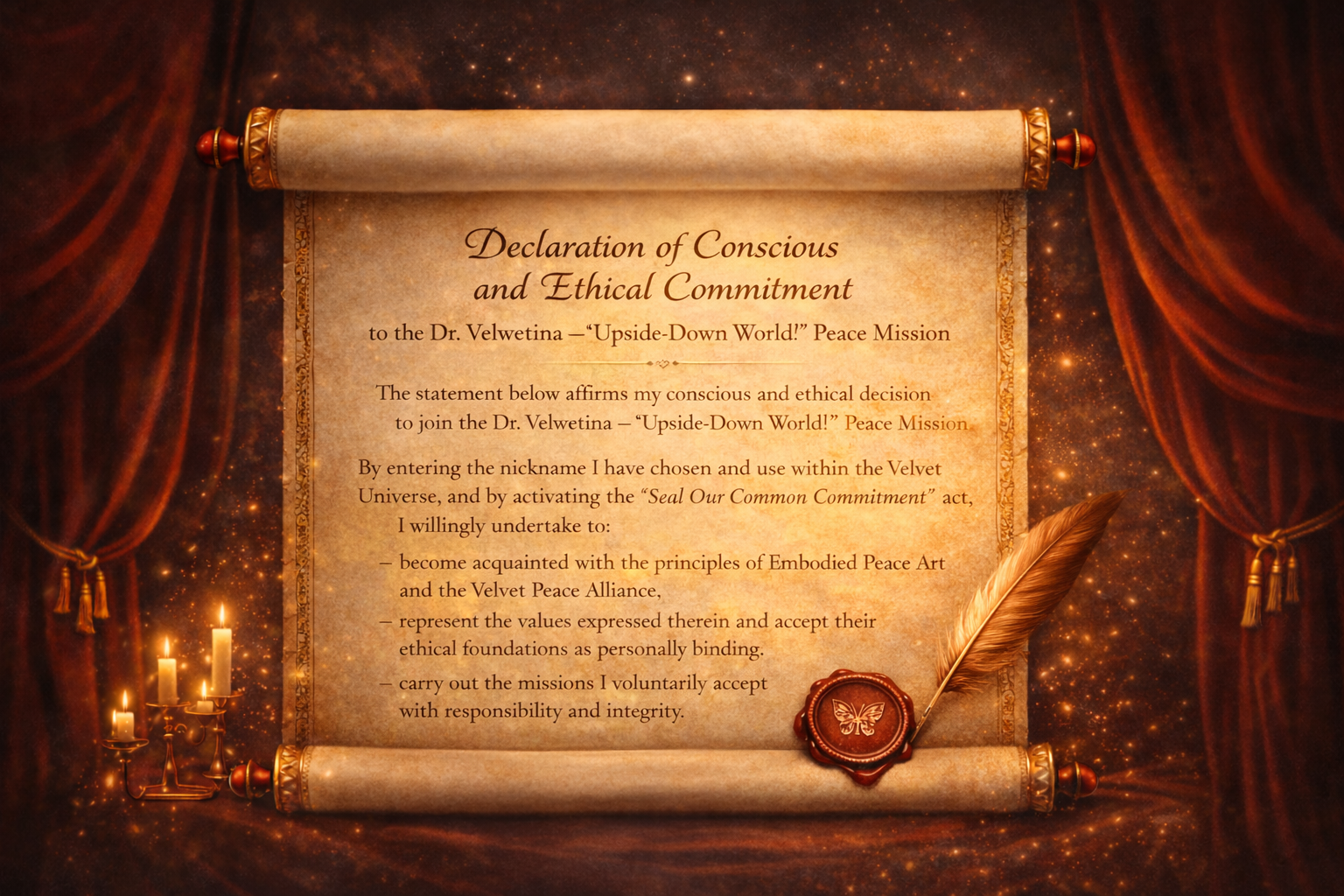 By entering the nickname I have chosen and use within the Velvet Universe, and by activating the "Seal Our Common Commitment" act, I willingly undertake to: